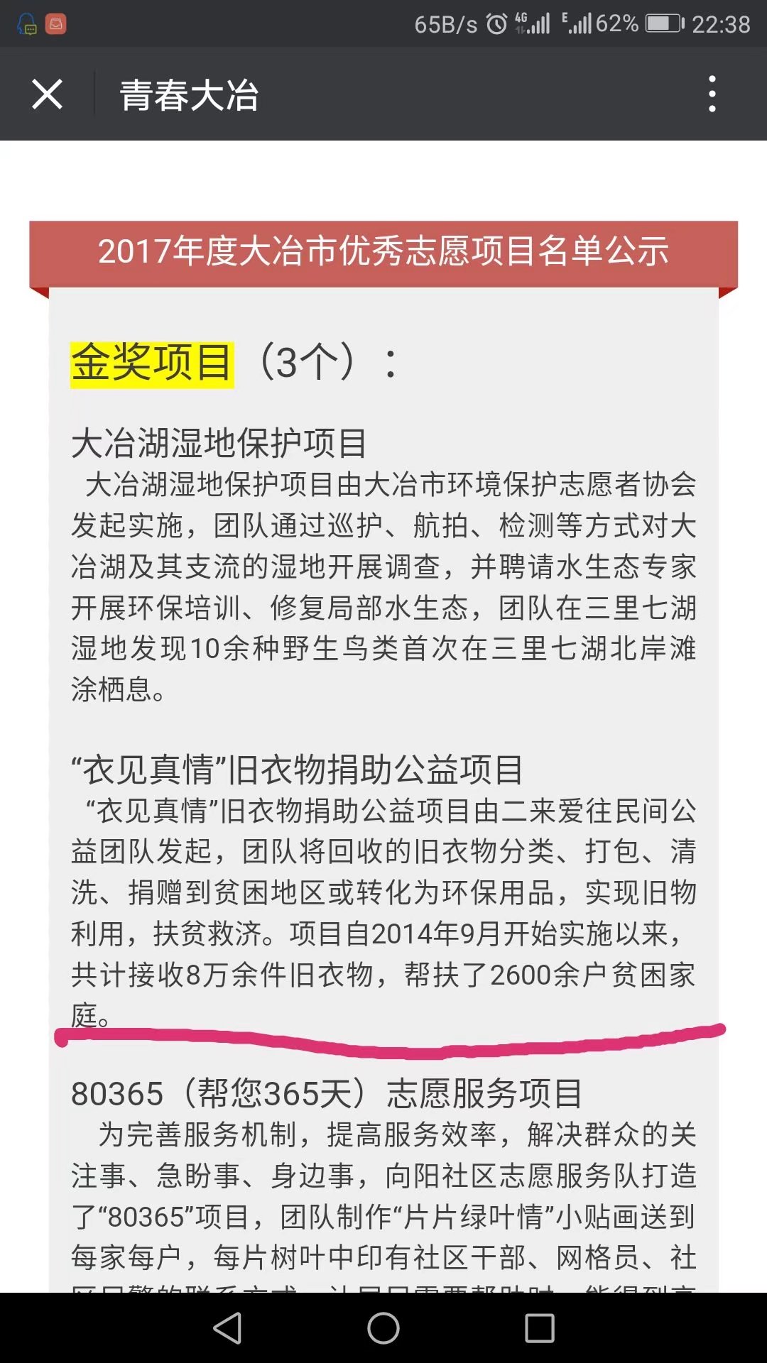 为进一步弘扬志愿服务精神,发挥先进典型的示范引领作用,不断提升全市志愿服务水平,共青团大冶市委近日在全市开展2017年度大冶市优秀志愿者、优秀志愿服务项目评选活动,团队四大项目之一的“衣见真情”旧衣物捐助公益项目被评为“2017年度大冶市优秀志愿项目金奖”。